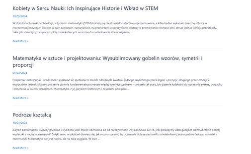 Strona internetowa projektu VisitMath przedstawia również wiadomości w formie artykułów pisemnych, odnoszących się do wielu aspektów związanych z przedmiotami STEM (nauka, technologia, inżynieria i matematyka), ale także architekturą, sztuką, projektowaniem… Podkreślane są również postacie historyczne i wkład europejskich matematyków. VisitMath pomaga młodym ludziom zakotwiczyć się we wspólnej tradycji naukowej i kulturowej, podkreślając, że matematyka jest wspólnym dziedzictwem wzbogaconym przez wieki odkryć i wymiany kulturowej.